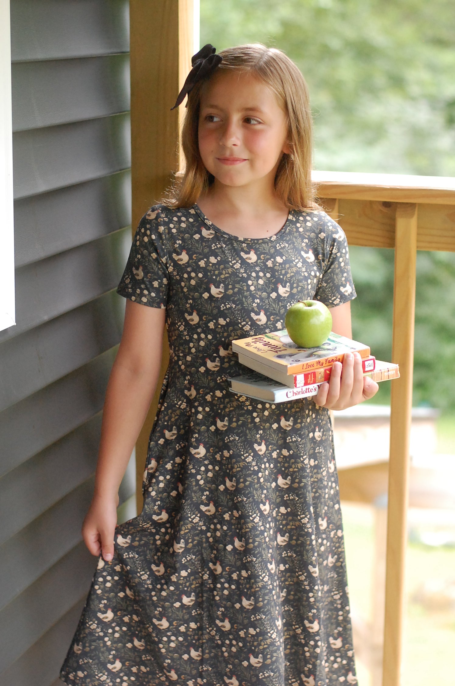 This cute 93% cotton 7% spandex dress is comfortable and stretchy! Has side pockets for egg collecting and storing other treasures!
